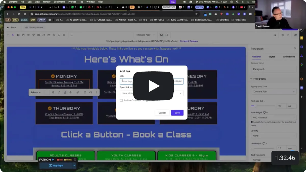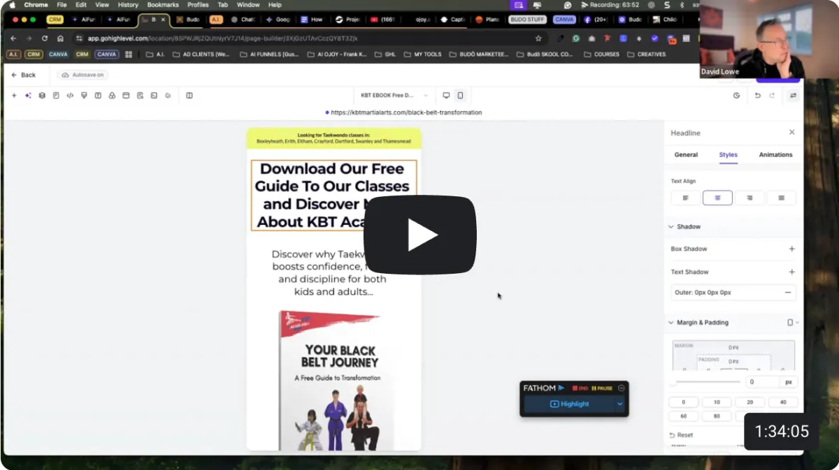 Next, David shared a new website layout and sales page template he had created that the group could use as a starting point. He walked through customising various design and layout elements, such as the hero section, pain points, class offerings, and testimonials.
